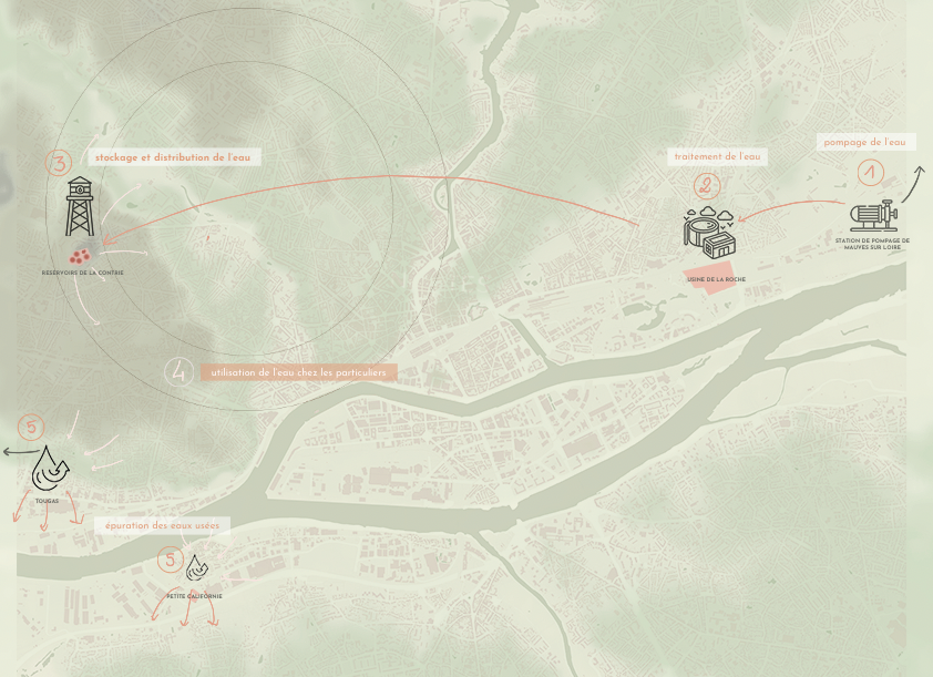 Le cycle de l’eau traitée à Nantes prend sa source dans la station de pompage de Mauves sur Loire (1) au Nord de la ville, puis l’eau arrive à l’usine de la Roche (2) au niveau du quartier de Malakoff, ensuite l’eau est filtrée et nettoyée et devient potable, elle est ensuite emmenée aux réservoirs de la Contrie (3). Ce quartier a été choisi en 1904 pour y installer les réservoirs pour une raison simple : c’est le point le plus haut de la ville. Ainsi, les réservoirs placé en hauteur au dessus de la ville, et l’eau est acheminée avec le même principe que celui d’un château d’eau : l’eau est mise en hauteur et coule ensuite dans les tuyaux par gravité, dans les 3200 km de réseaux pour approvisionner tous les utilisateurs (4). Une fois l’eau usée elle est amenée dans les stations d’épurations où les boues sont triés et relâchées. (5)