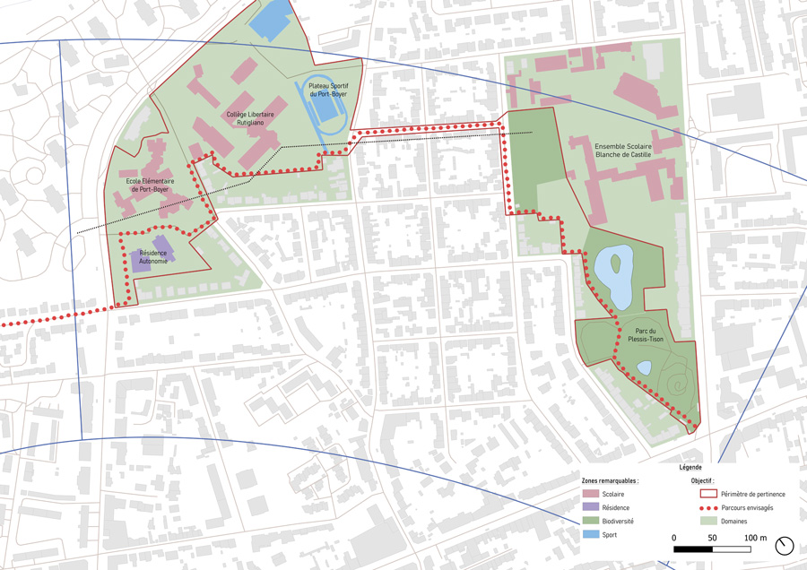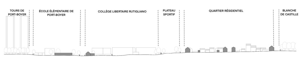 L’ensemble Blanche-de-Castille, l’école élémentaire de Port-Boyer et le collège Libertaire Rutigliano, rythment la vie du quartier par les entrées et sorties de cours. Mais les parvis ne sont que peu aménagés et constituent des temps morts urbains. Par le travail de la lisière scolaire, comment protéger élèves et parents des dangers de la route ? Où garer les vélos ? Mais surtout, comment penser des aménagements qui prolongent les usages au-delà du strict temps scolaire ? Les parvis deviennent alors un enjeu pour la création d’espaces de jeu et de rencontre, permettant de faire de l’école une porte d’accès vers un parcours éducatif à travers le secteur, plutôt qu’un îlot fermé entre deux grilles.