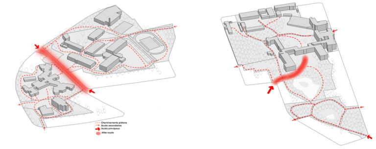 Les deux quartiers fonctionnent aujourd’hui en parallèle sans réelle connexion piétonne ni piste cyclable qui les relie. Les pôles scolaires, public d’un côté et privé de l’autre, séparés par un tissu résidentiel manquant cruellement d’espaces publics, créent des polarités à dépasser. Travailler une continuité Est–Ouest permettrait de dépasser l’entre-soi, d’ouvrir des usages et de diversifier les parcours quotidiens pour une plus grande mixité sociale. Ainsi, former des liaisons en un maillage doux constituerait la première étape de la création d’un parcours à l’échelle du secteur en suscitant une plus grande porosité qui permettra également de constituer une balade métropolitaine unique.