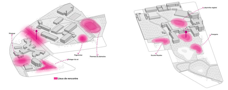 Le premier scénario propose d’assembler l’école élémentaire de Port-Boyer, le collège Libertaire Rutigliano, le plateau sportif et la résidence autonomie pour créer un domaine, une nouvelle centralité paysagère à Port-Boyer similaire au parc historique du Plessis-Tison et de Blanche de Castille, à l’est du secteur. Cela donne une nouvelle identité forte au quartier permettant de rassembler les habitants et de rééquilibrer la balance entre les polarités du secteur. Sur le même principe, nous souhaitons également renforcer la dimension domaniale manifeste dans le Parc de Plessis-Tison.