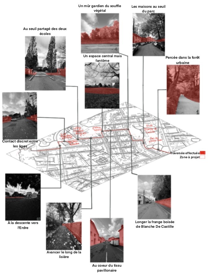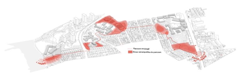 Notre approche consiste à prendre le parti des marges et des lisières en longeant les points saillants du secteur, des entités à préserver et valoriser, qui permettent la pause dans la balade en s’arrêtant dans des espaces publics enrichis et recomposés en de véritables parcs urbains.