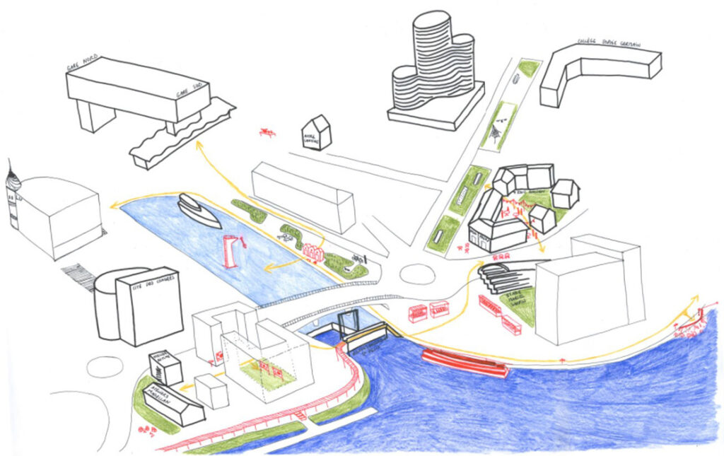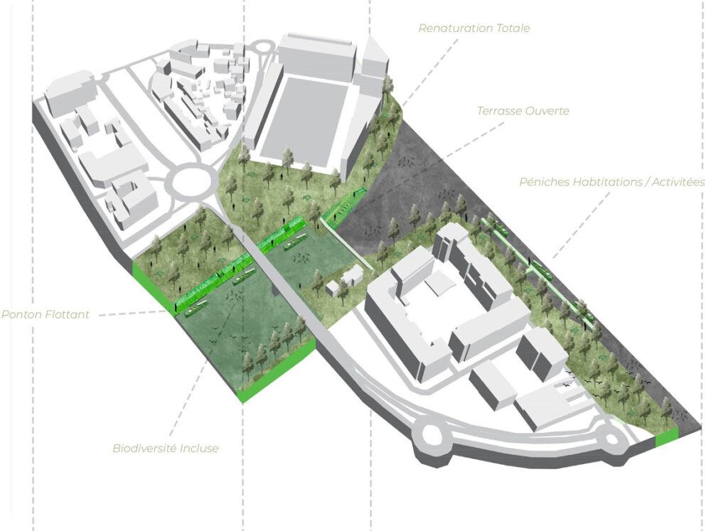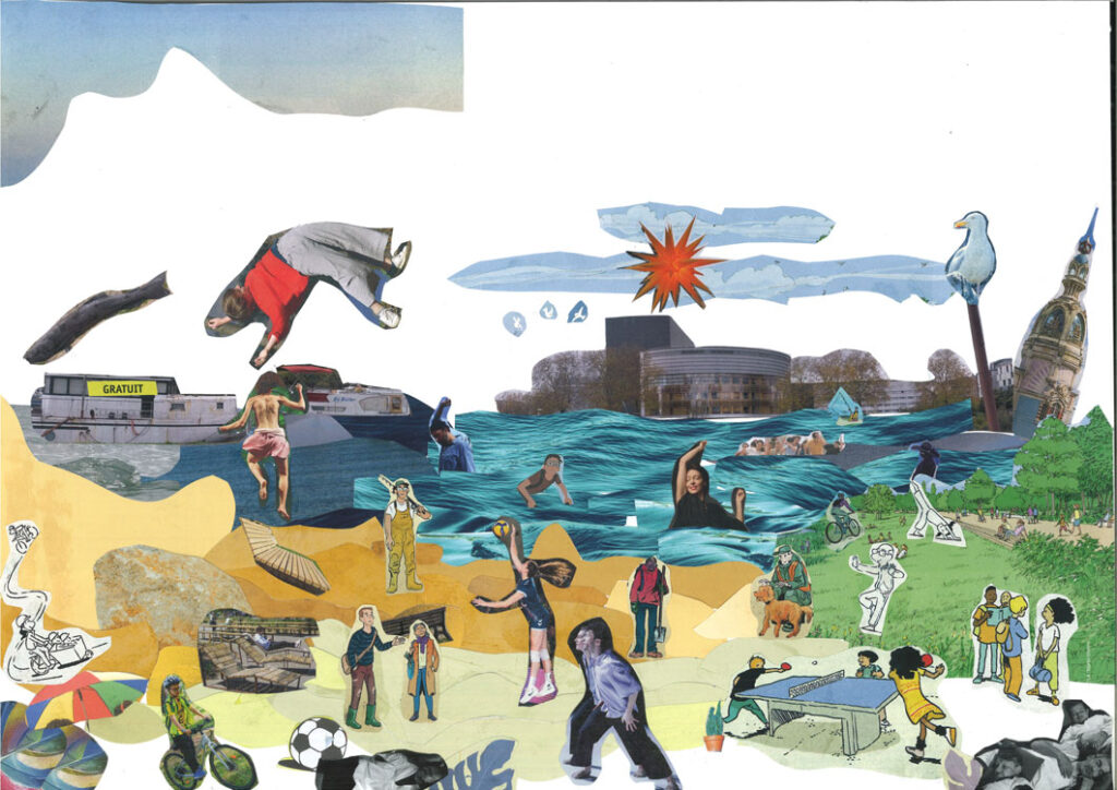 L’Erdre est un élément marquant du paysage de Malakoff mais c’est également un élément absent dans le quotidien des habitants. Nous souhaiterions développer des activités en rapport avec ce cours d’eau, à l’intérieur et autour. Il s’agit tout d’abord de dépolluer l’eau du canal pour assurer une baignabilité et d’organiser celle-ci tant par les services liés (conciergerie, vestiaire, restauration, …) que par l’aménagement du quai Malakoff en lui-même (plage urbaine, …) qui s’ouvre au canal et leur relation devient poreuse. On peut également s’interroger sur le devenir de la biodiversité dépendant de ce canal et donc au passage des poissons, aux espèces botaniques choisies…