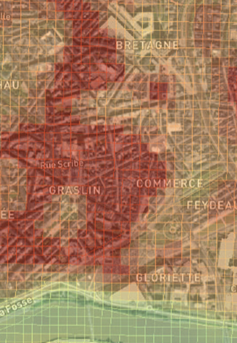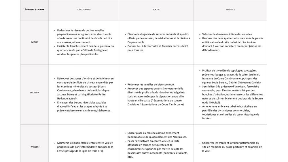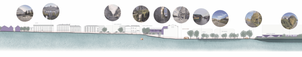 Unique secteur du transect en contact direct avec la Loire, il est particulièrement soumis aux menaces climatiques en cours. En effet, si le fleuve décide de sortir de son lit, les berges vont devoir faire preuve de réversibilité et d’adaptabilité face à cette grande entité incontrôlable. Ce phénomène majeur cache un autre trait plus discret mais tout aussi important ; celui des interstices. Ainsi, si la Loire a grandement dessiné la ville, d’autres tracés plus ou moins repérables y ont aussi participé. Des venelles résiduelles découlent des grands axes structurants qui se jettent dans la Loire et qui sont très exposés comme le Cours Cambronne ou le Quai de la Fosse.