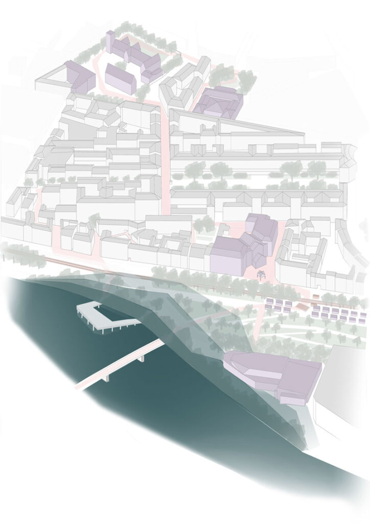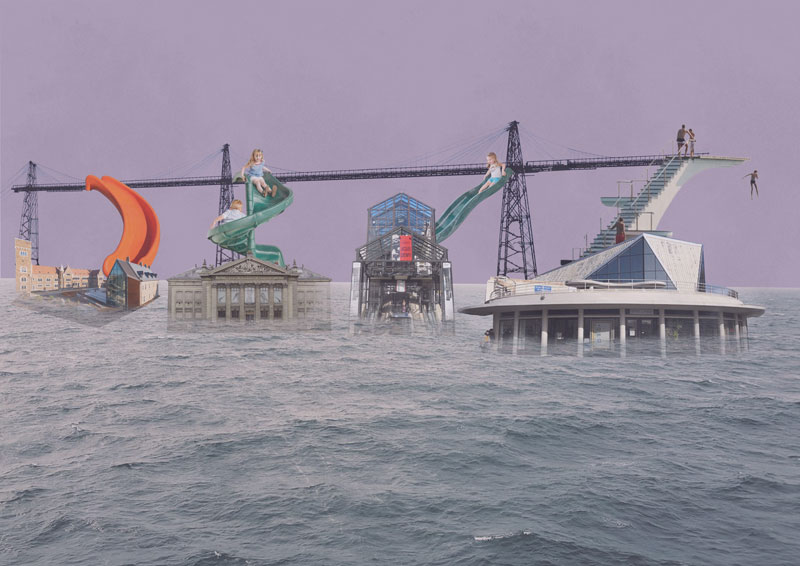 Ici, la création de passages pour traverser d’un équipement à l’autre est matérialisée par un pont continu duquel on accède aux équipements par des toboggans. Il prend la forme de l’ancien pont transbordeur de Nantes, anciennement visible depuis le bassin de la piscine Léo Lagrange, et s’étend en un plongeoir relié au toit de la piscine. De ce dernier, on saute dans la Loire débordante qui devient alors un bassin naturel. La montée des eaux est ici exagérée, seuls les équipements subsistent, supposant que le sport et la culture sont les seules choses qui émergent et auxquels on peut se raccrocher quand la nature reprend ses droits.