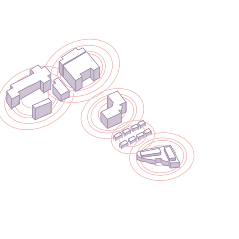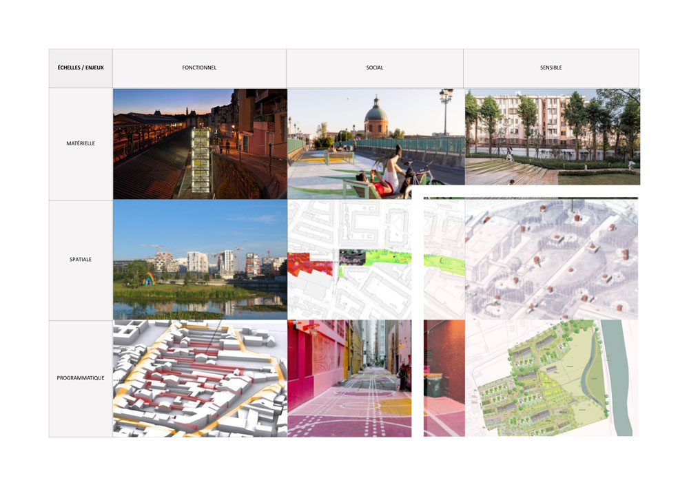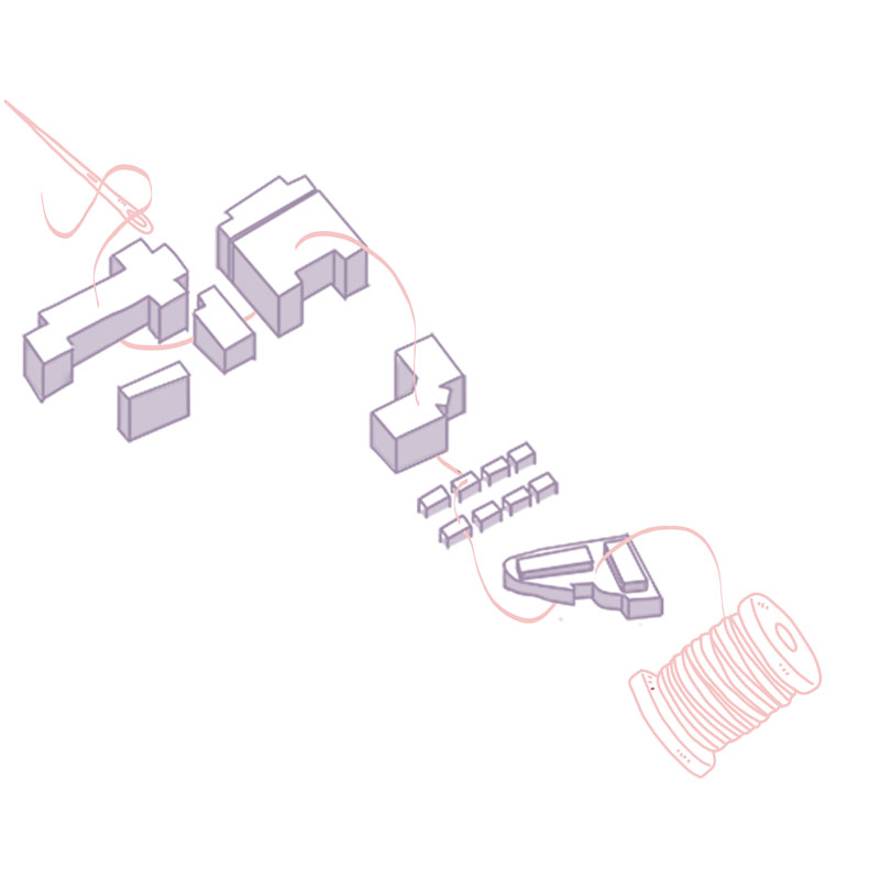 L’objectif est ainsi de créer une diagonale entre les communs, un réseau qui incite le passage du bouquin au bassin et du bain de soleil à l’exposition on. Deux scénarios se détachent : tracer une continuité spatiale ou ériger des éléments saillants laissant libre le développement des liaisons. Ces solutions passent par les venelles s’inscrivant ainsi dans une volonté de mise en valeur des axes mineurs. Les propositions pourraient alors inclure des œuvres d’art ou des équipements sportifs ponctuels et successifs pour poursuivre les services proposés.