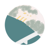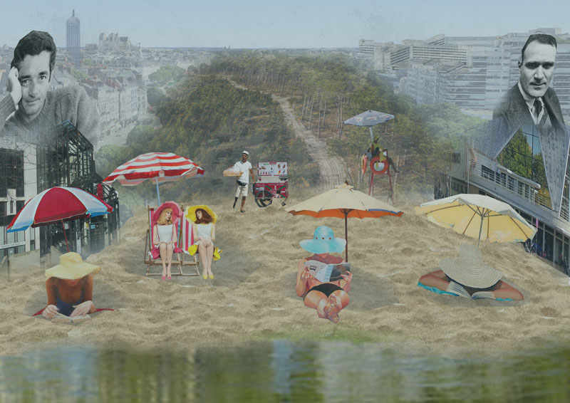 Alors que les berges devaient être repensées, celles-ci se sont transformées en plage desservie par les chemins dessinés du parc Archipel. Ce dernier prend place entre les deux fronts bâtis qui délimitaient anciennement le bras de l’Hôpital, un espace longtemps dédié au stationnement des voitures avant son réaménagement. Le marché, représenté ici par le marchand de beignet, n’a pas été déplacé mais seulement réagencé. De chaque côté, la Médiathèque Jacques Demy (à gauche) et la Piscine Léo Lagrange (à droite) sont surmontées par la figure masculine qui leur a donné leur nom, comme c’est souvent le cas dans la toponymie de la ville. L’une représente la culture, l’autre le sport, deux pratiques à mettre en lien dans ce quartier. Les femmes sortent alors de la piscine en maillot de bain, déploient leurs parasols pour se protéger du soleil frappant et profitent d’un livre emprunté à la bibliothèque d’en face pour se poser au bord de la Loire.