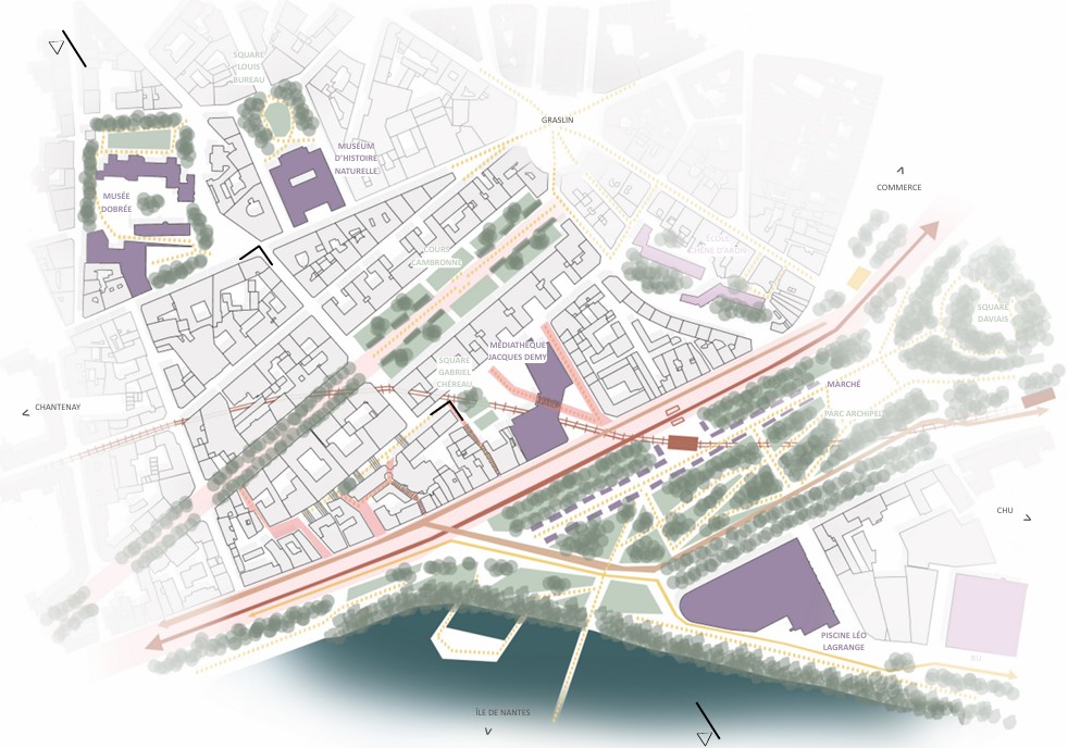 Aucune de ces entités ne vient seule car elles sont toutes accompagnées d’un espace vert au traitement végétal qui lui est propre, créant ainsi une variété de typologies paysagères au sein du secteur. On retrouve alors les berges sauvages de la Loire, les parterres plantés et délimités du parc contemporain Archipel au pied de la piscine, les petites pelouses vertes et les quelques parcelles potagères du square Gabriel Chéreau qui juxtapose la Médiathèque et ses parvis imperméables, le rappel des jardins à la française avec le Cours Cambronne, le jardin associatif du square Louis Bureau derrière le muséum et pour finir le musée Dobrée avec son contour arboré percé de part et d’autre.