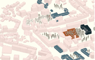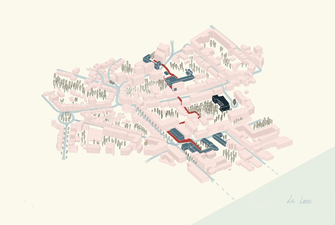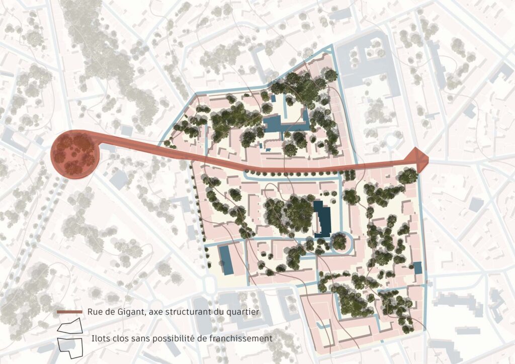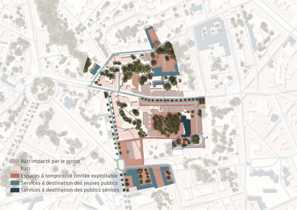 Cette carte met en évidence l’organisation du site et les effets du projet sur le tissu urbain existant.