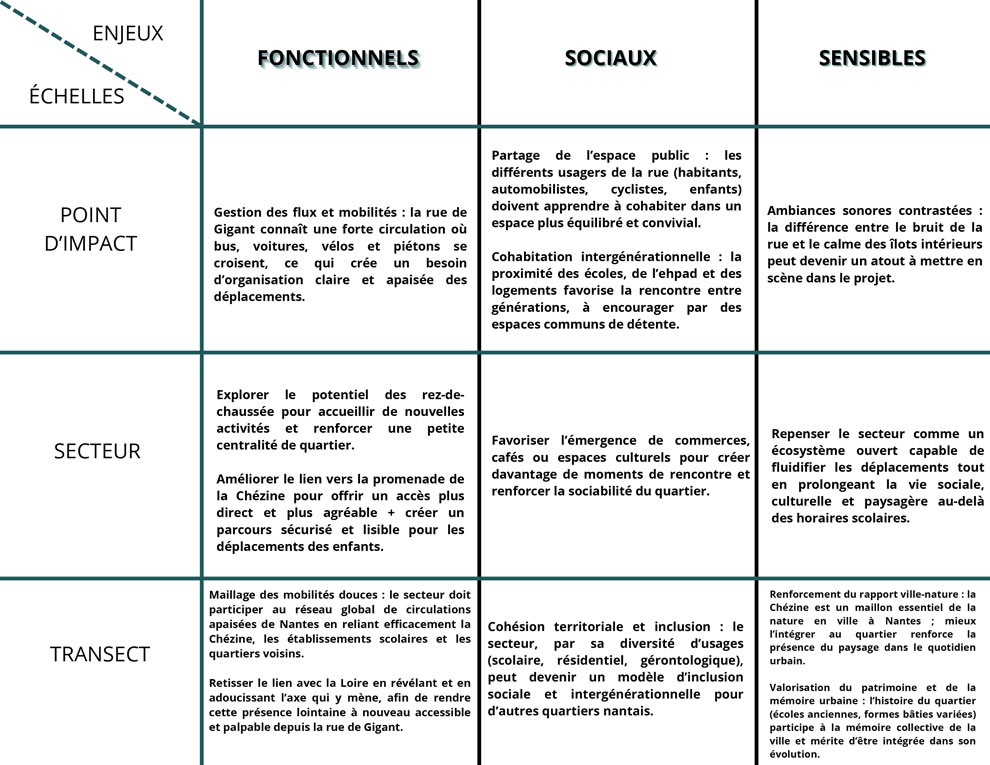 La rue Marie-Anne du Boccage accueille les écoles maternelle et primaire Marie-Anne du Boccage, l’école privée catholique St-Michel et le lycée Gabriel Guist’hau. Ainsi cette forte présence d’établissements scolaires laisse place à un enjeu où le contexte nous invite à imaginer et penser un espace pour les enfants à la sortie des écoles. L’idée serait : un lieu, un espace vert ou ces derniers pourraient se détendre, jouer et prolonger leurs moments de sociabilité après leur classe. Cependant une grande partie des espaces verts déjà présents sont privés ainsi comment créer un espace adapté dédié aux écoliers sans franchir la limite des espaces privés ?