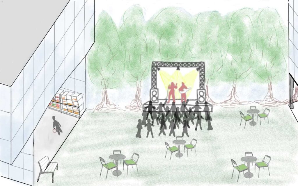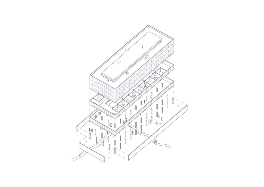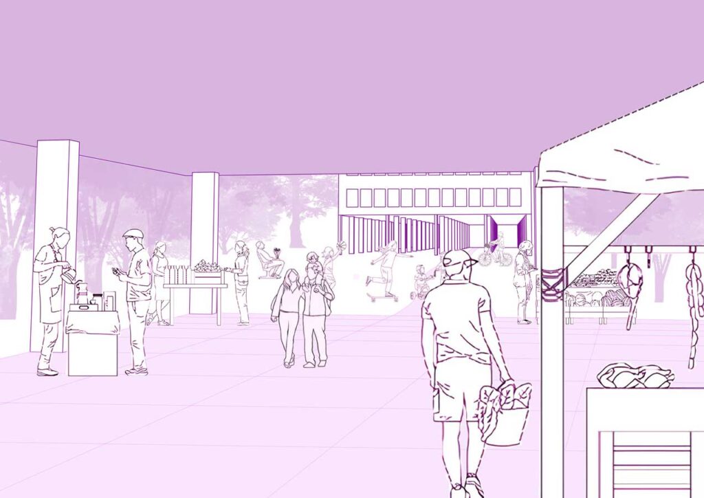 Pour illustrer cela, notre scénario programmatique rend les rez-de-chaussée poreux de manière à agrandir l’espace public. Nous proposons donc d’aménager un marché, une place pouvant accueillir des évènements ponctuels comme plus réguliers et un rez-de-chaussée sous forme de porche.