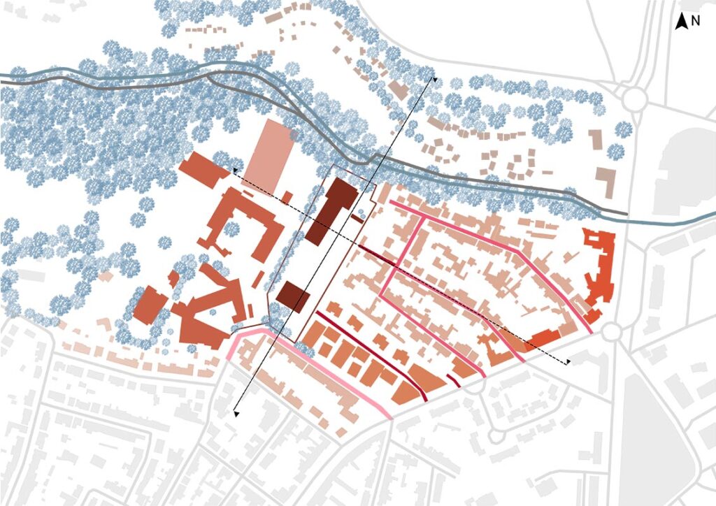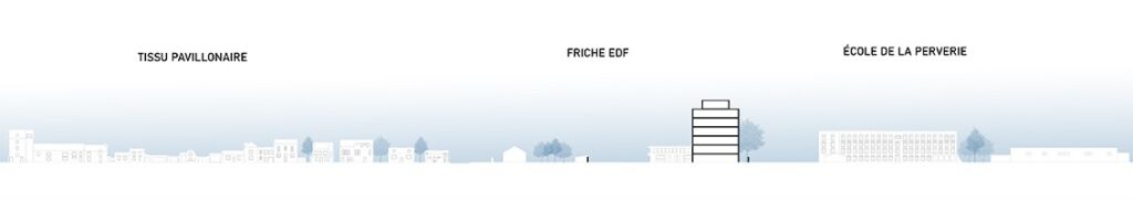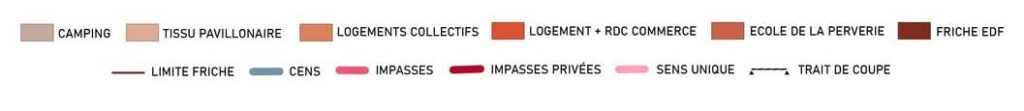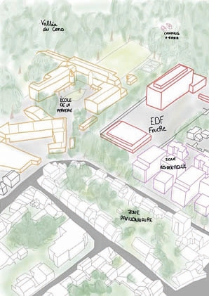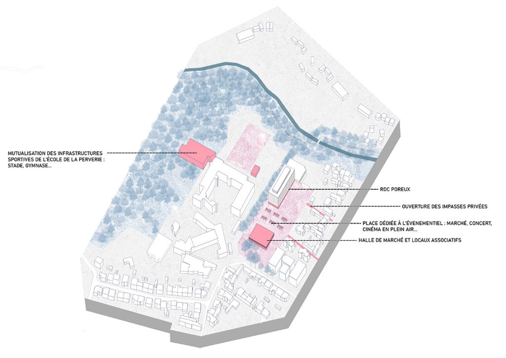 La friche EDF apparaît comme le nœud des entraves du quartier de la Perverie. Son implantation crée une barrière aussi bien physique que visuelle entre l’école du sacré-cœur et les tissus résidentiels du quartier. Ouvrir et mutualiser cet espace au public permettrait de recréer une respiration au sein du quartier en créant une centralité et un lieu de rencontre, absent au quartier. Le traitement du bâti existant est aussi source de question et de potentiel, il est à la fois vecteur de potentiel programme et élément hors échelle qui pourrait freiner la respiration vers la vallée.