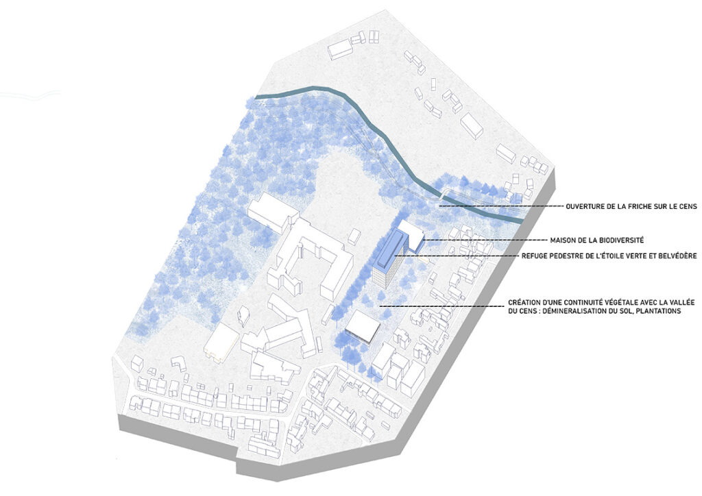 Le 2ème axe d’hypothèse programmatique concerne la revalorisation de la vallée du Cens par la réouverture de la friche vers la vallée. D’après nous la connexion entre la friche et la vallée du Cens permettrait le développement d’un 3ème degré d’hospitalité au-delà du quartier, en lien avec l’accueil des randonneurs et le dispositif de l’Étoile verte.