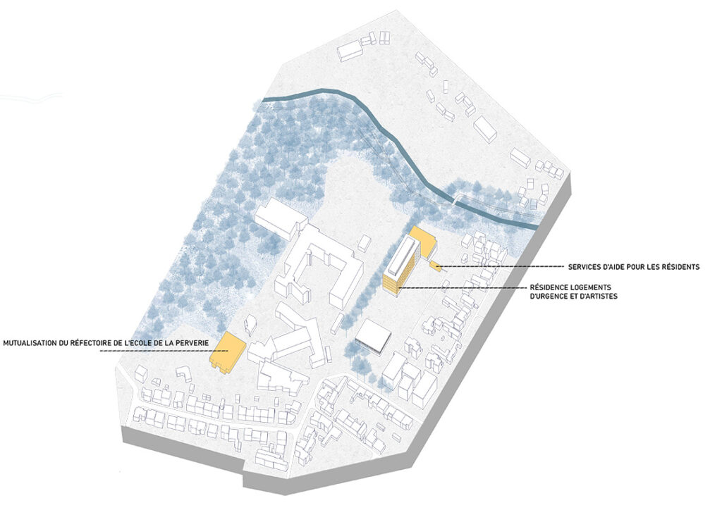 Notre proposition programmatique serait donc d’utiliser les bâtiments présents dans la friche pour apporter des logements de secours pour toute personne en situation de précarité mais également des ateliers d’artistes. L’objectif n’est pas uniquement de fournir un espace de vie, mais aussi un lieu d’échange et de solution pour soutenir et intégrer chaque individu à l’échelle de la ville.