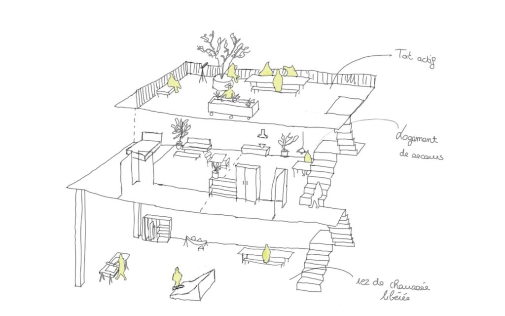 Elle pourra ainsi faire office de chemin de traverse et faciliter l’accès à la Vallée du Cens. En plus d’y avoir accès, les usager.e.s pourront gravir le toit de la friche pour voir le quartier sous un angle nouveau. Iels pourront retrouver un lien contemplatif à la nature. Les promeneur.euse.s pourront y voir un sémaphore à la fois point de repère, refuge et récompense après avoir arpenté l’étoile verte de l’Erdre au Cens. Cette vallée, qui est un trait d’union entre les quartiers, est une entrée vers la friche. Les inconnu.e.s d’hier deviendront des voisin.e.s d’aujourd’hui.