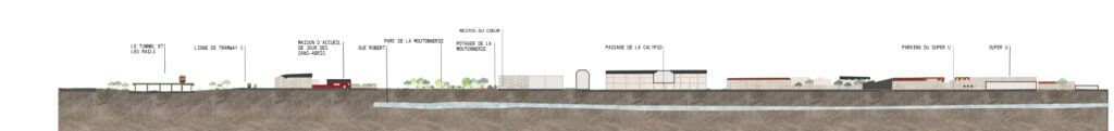 ainsi tenter de les mettre en résonnance en prolongeant l’idée d’un parc jusqu’au parking en désartificialisant son sol et en connectant les deux enclaves par l’avenue de la calypso.
