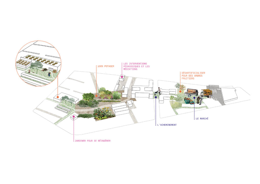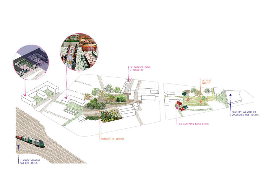 des arbres fruitiers. Cependant l’entièreté de son sol n’est pas renaturalisé, mais apte à s’insérer dans le tissu urbain existant en implantant des habitats modulaires à destination femmes et des hommes sans domicile pris en charge par la maison d’accueil de jour. L’acheminement est pensé par les rails de la gare à proximité à l’échelle de la métropole.