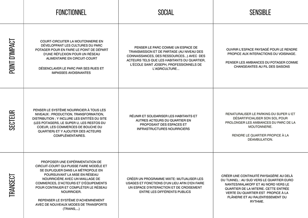 Enfin, ce système présent uniquement à l’échelle d’un secteur n’aurai que très peu d’impacts. Ce principe est ainsi supposé exportable et duplicable à l’échelle du transect et de la métropole Nantaise, dans le but d’agir de manière conséquentes et ponctuelles sur les questions de sécurité alimentaire. Par les quelques ingrédients à projets développés, de nombreux scénarios sont possibles selon les contextes urbains.