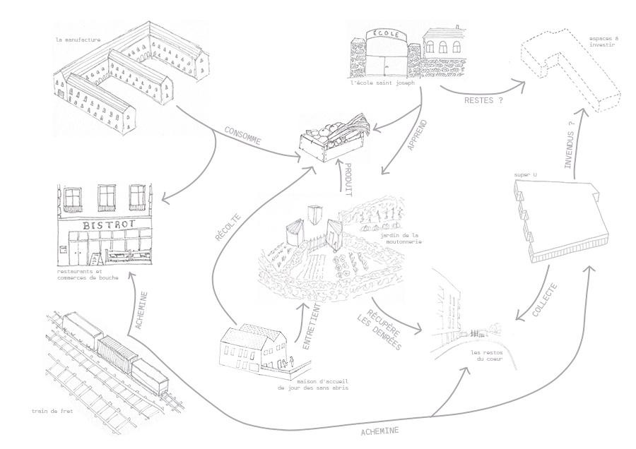 En puisant dans les racines du parc, il est aisé d’imaginer étendre les espaces cultivés (potagers, vergers) sur toute sa superficie, de les mettre à la vente et en relation avec bon nombre d’autres infrastructures du quartier, alimentaires ou non. Cette mise en réseau permettrait la création d’un circuit court alimentaire, faisant intervenir différents acteurs en lien avec la thématique nourricière. La mise en place de notre système nourricier est permise dans un premier temps, par l’intervention d’acteurs sociaux comme les Restos du Cœur et la Maison d’Accueil de Jour des sans-abris. Ils joueraient un rôle central dans l’accès à l’alimentation pour tous et dans la réinsertion. À cela s’ajoutent les acteurs pédagogiques et culturels, tels que La Manufacture et l’École Saint Joseph. Une transmission de savoir pourrait alors s’opérer entre ces derniers et des médiateurs ou spécialistes de l’agriculture dans une perspective de sensibilisation.