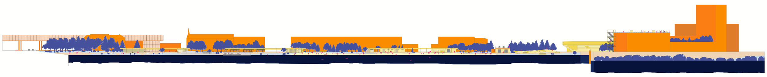 Le projet prend place sur les berges tout en requestionnant les infrastructures présentes et équipements avec ce grand parking à transformer et requalifier. Pour rebondir sur ce que grégoire a dit nous travaillons principalement sur la berge Est, plus d’espace à disposition, nous venons séquencer l’espace pour apporter du rythme à partir des tracés des rues existantes, fabriquant des nouvelles entrées vers un espace publique repensé tout en créant des cadres de vue vers l’autre berge inversant alors ce rapport acteur spectateur.