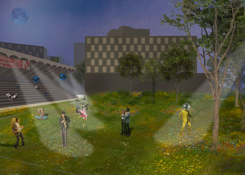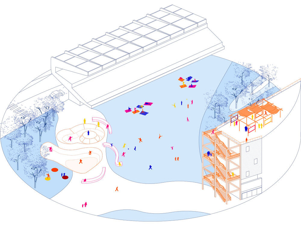 Puis nous passons sous le pont continuant se tour autours de l’erdre, arrivant au stade Marcel Saupin, un lieux qui pose question, mythique, privée, mais qui aujourd’hui ne participe peu à la vie du quartier, et par le fait que la 4ème tribune de celui soit non bâtis, nous profitons de ce fait pour faire de ce lieu mythique un espace ouvert et pas dédié à seulement une pratique mais bien à une multitude de possibles. La tribune reste elle-même comme un objet sacré, spectatrice de diverses appropriations, un espace de pause en été, un picnique en famille, ou bien le soir un stade se transformant en espace de fête. L’espace devient alors une plaine avec de légers aménagements topographiques pour pousser d’autres pratiques à exister et se faire une place dans l’espace publique.