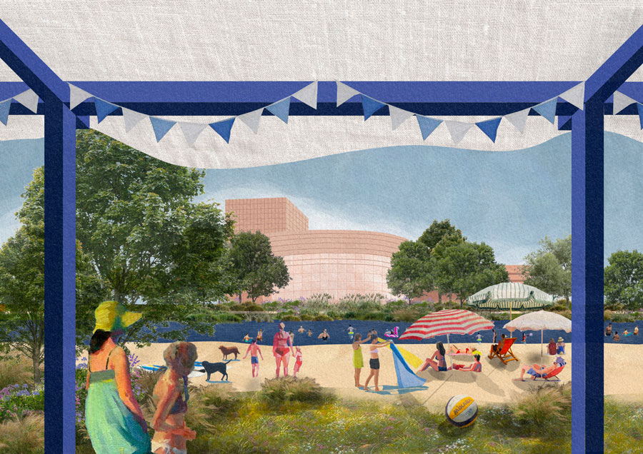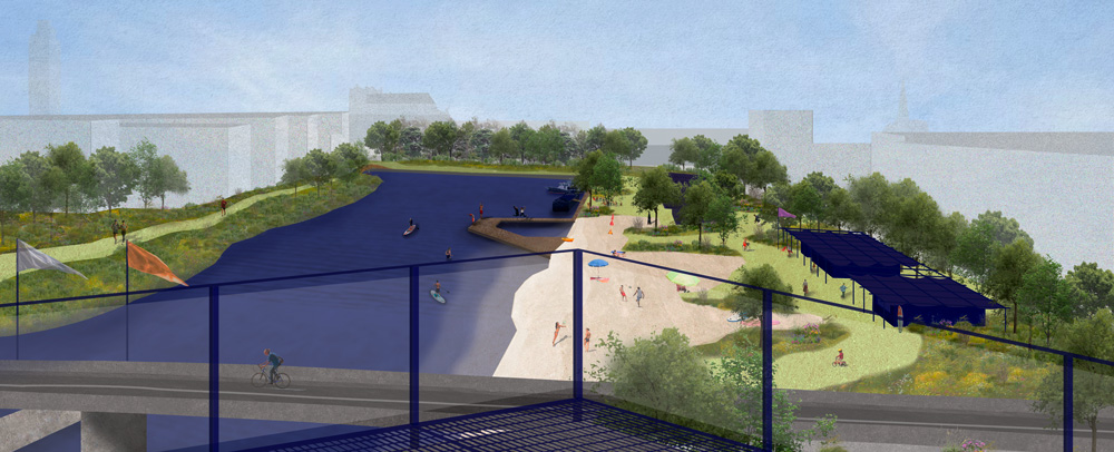 Anctuelle grande frontière entre Malakof et les Olivettes, L’Erdre deviendrais un élément central du projet : non plus une frontière, mais un support de pratiques corporelles et nautique, transformée en espace de baignade publique, en lieu de soin et de détente opposé à la cadence économique de la métropole. Celle ci serais aussi un point d’approche du rapport au vivant, comme les végéteaux et la vie animales mais égalemment à l’autre que l’on ignore si souvent.