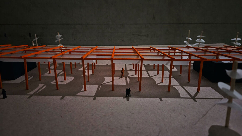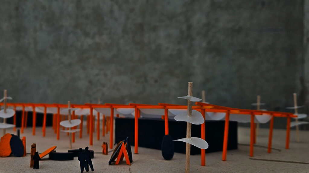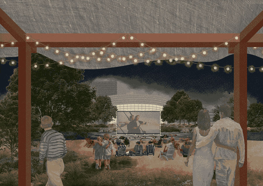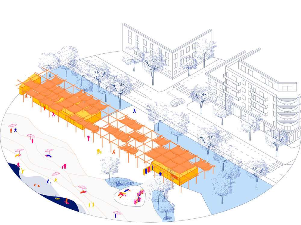 Concernant les infrastrucures et leurs dessins nous avons voulu retrouver une architecture en ayant un rapport à l’eau une écriture proche de l’architecture balnéaire avec l’icone de celle-ci la chaise du sauveteur retrouvé dans le belvédaire, les espaces sont alors assez libres peremettant d’y acceuillir des pratiques diverses, expositions, concerts, espace couverts protégé, ils sont composés de deux locaux et relier par une même sutrcture dessinant les entrées du site, et pour couper par rapport à cet axe de circulation passant, la végétation prend place et et la toiture prend un angle pour s’ouvrir sur l’Erdre.