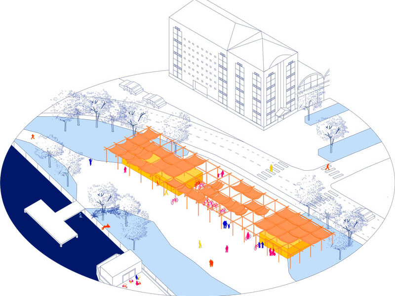 La première partie du quais vient se diviser en trois, dans un rapport à la gare plus factuelle, nous requalifions le parking à vélo existant, le rendant plus accessible et ouvert à tous, valorisant les mobilités douces, acompagnés d’un espace de réparation de vélo.