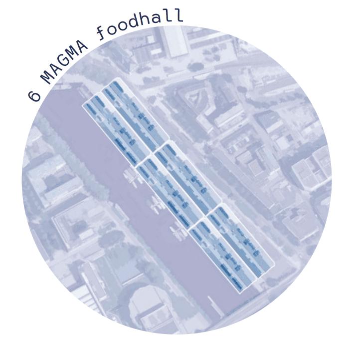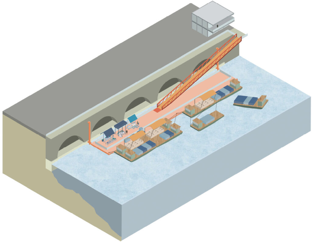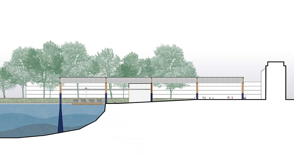 Le Marché d’Intérêt Métropolitain se formalise par une bande technique permettant les fonctions de stockage et logistique couverte par une large toiture. L’ensemble est rendu poreux en créant une bande accessible le long des berges et en ouvrant ponctuellement la bande technique sur l’Erdre. Les camions chargés entrent dans la bande technique et sont déchargés par un système de pont roulant. Les ponts roulants viendraient ensuite charger les 120 toues en marchandises. Ponctuellement dans la semaine, on pourrait envisager que les toues chargées restent à quai pour être investies sous forme de marché flottant.