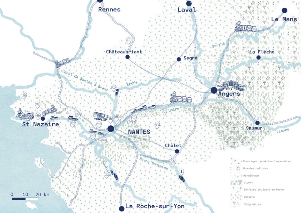 Pour mettre en place ce réseau, la première étape consiste à penser un système de logistique cohérent. Nous avons donc séparé les flux d’approvisionnement des ressources alimentaires en 2 segments. Le premier par acheminement ferroviaire avec les trains de FRET en s’implantant en continuité de la gare et le second acheminement par voie fluviale en s’implantant sur les berges de la Loire légèrement en amont du canal St Félix au niveau des berges de Sarrebrucks.