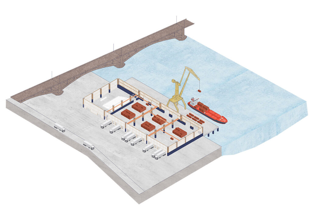 Axonométrie de l’acheminent par voie ferrée Axonométrie de l’acheminent par voie fluviale