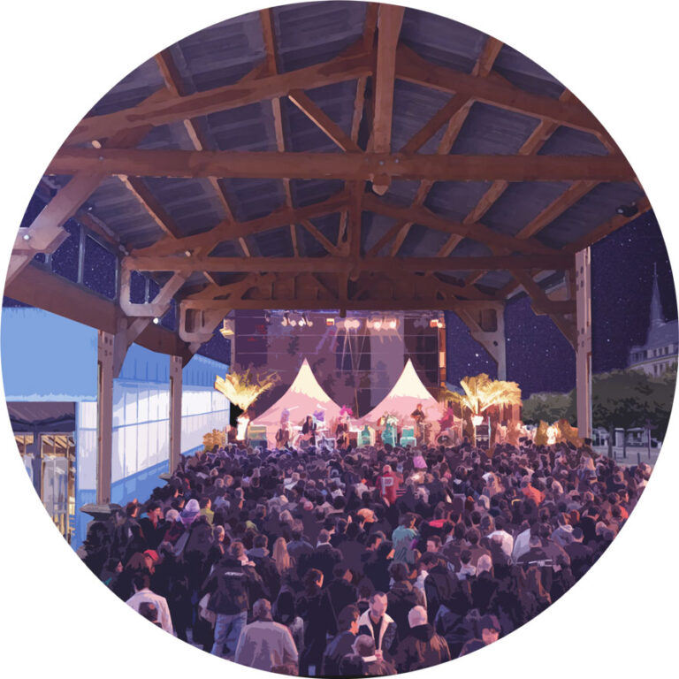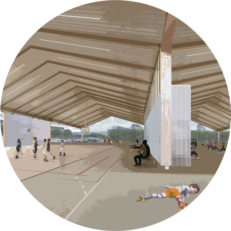 Enfin, une telle logistique d’acheminement et de chargement des marchandises se déroule essentiellement tôt le matin. Ce constat nous a poussé à nous questionner sur comment le MIM pourrait faire espace public à d’autres temporalités, tout en sachant que son usage principal reste celui d’une plateforme logistique. On pourrait en effet imaginer que cet espace soit investi pour des pratiques sportives (en raison de ses dimensions généreuses), tant sur terre que sur l’eau. La bande technique pourrait être investie en vestiaire. Le mini MIN peut aussi conserver sa vocation nourricière en se transformant en lieu de distribution de soupe populaire, tout en mobilisant les acteurs du secteur tels que l’Autre Cantine. La distribution des soupes populaires pourrait aussi se calquer sur le modèle d’acheminement de la plateforme : par les toues. En raison de sa proximité avec la gare, l’endroit pourrait être investi pour le tourisme et les actions culturelles, comme un point de chute du VAN qui pourrait proposer des visites de Nantes par les eaux. Enfin, les grandes dimensions du MIM pourraient lui permettre d’accueillir des scènes de spectacles/concerts pour faire vivre le site à toutes les heures de la journée.