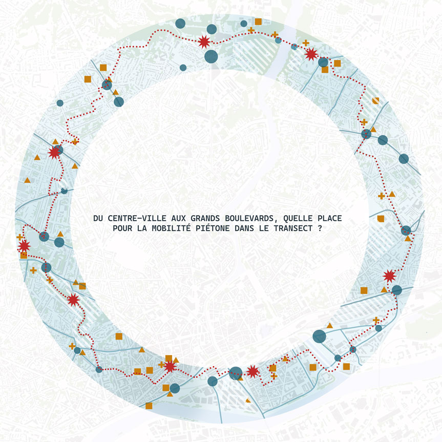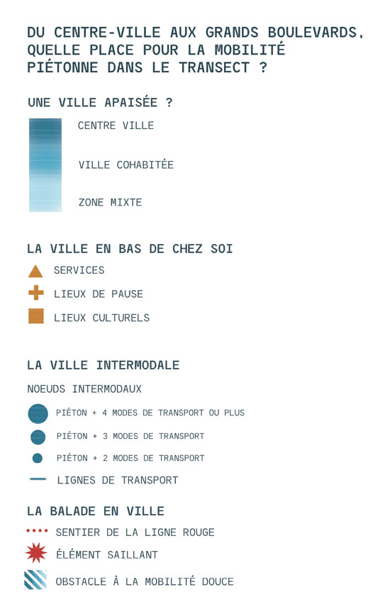 La carte parcourt différentes échelles : celle du transect par les 3 niveaux de “ville apaisée ?” et celle du secteur avec la ligne rouge.  Les nœuds intermodaux font la transition à l’échelle de chaque quartier grâce à la partie « la ville en bas de chez soi”. Ainsi Nantes peut être classée en deux types :