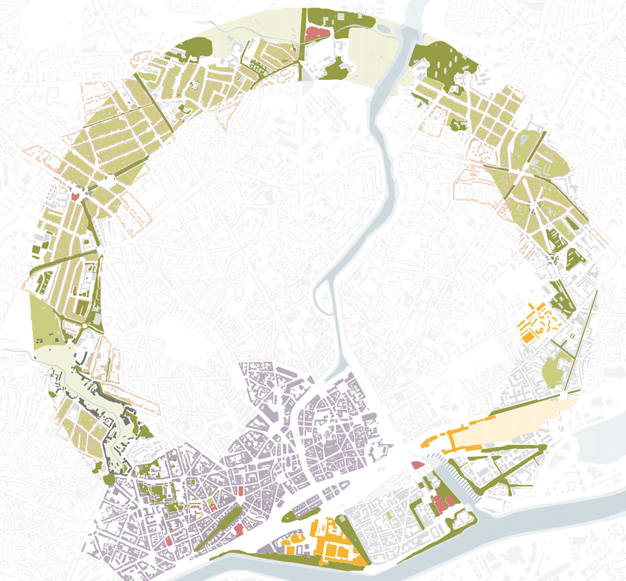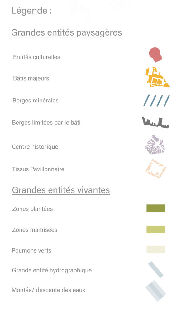 Les “paysages vivants”, une dimension à la fois sociale dans l’idée qu’un paysage est esthétique et immatériel mais c’est surtout une notion sensible, abstraite et visuelle. La “grande entité” désigne une unité urbaine composée de sous-entités imbriquées. La ville est pensée comme une imbrication entre des éléments d’échelles et d’usages différents voire opposés, mais qui forment, plusieurs grandes entités urbaines, plusieursmorceaux de ville remarquables…