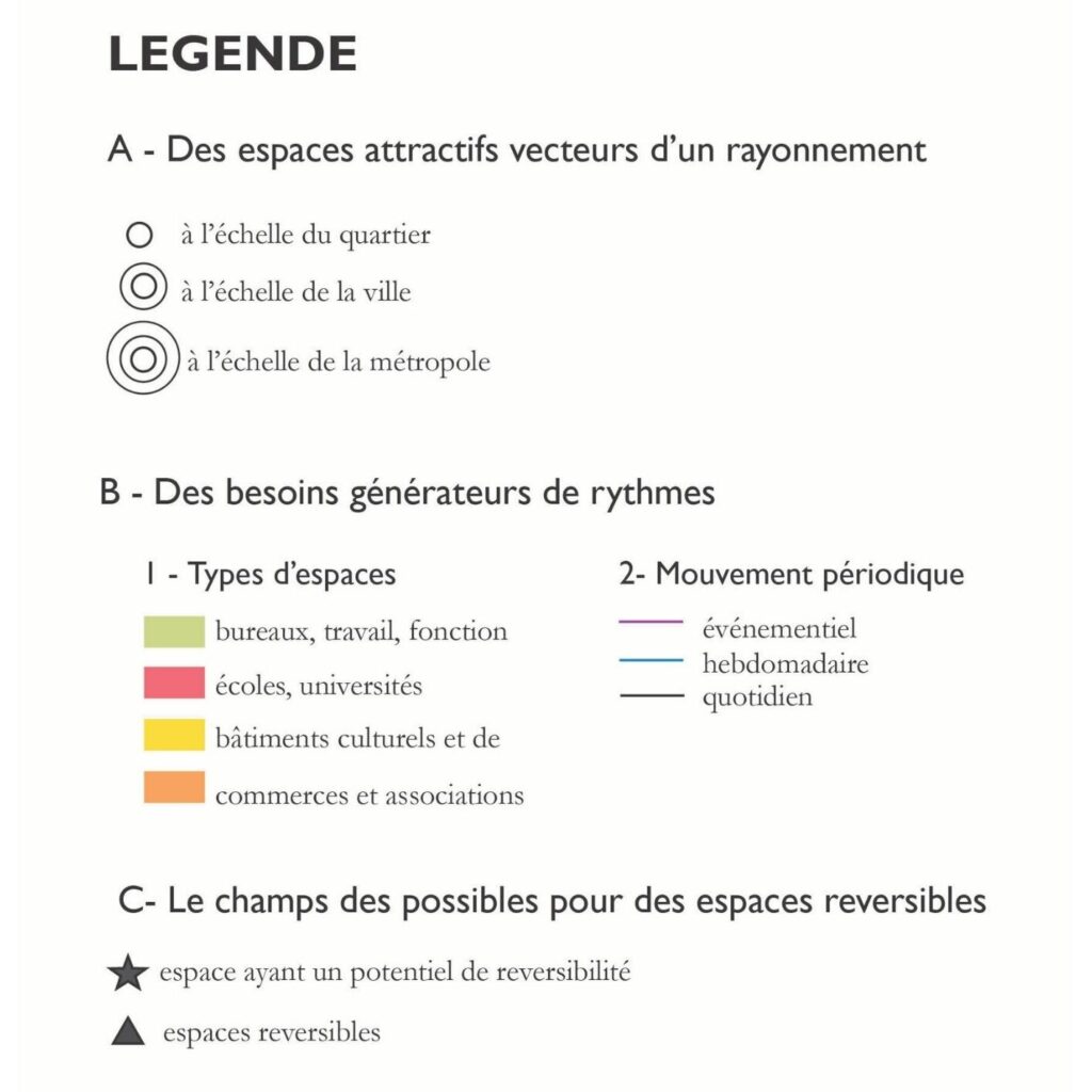 Au travers de cette carte, les temporalités et les rythmes ne sont pas retranscrits uniquement comme des objets formels, mais mettent en valeur une appréciation sensible du territoire. La prise en compte de la dimension non variable de la temporalité et l’inscription des rythmes comme un mouvement dans le temps. Ces deux approches permettent de penser l’espace public dans une plus grande durabilité.