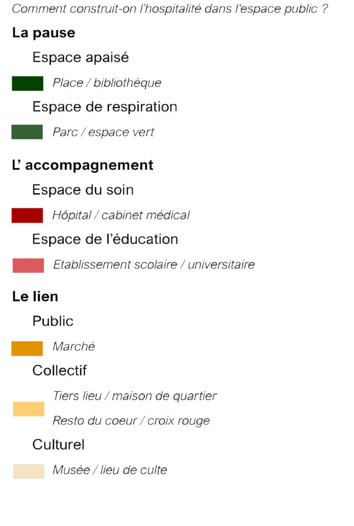 L’hospitalité ne se limite pas à l’accueil physique. Elle repose sur des facteurs tels que l’espace, la lumière, le bruit, la matérialité, mais également une construction collective, qui dépend autant des infrastructures que des appropriations qui en sont faites. Cette carte montre que le bien commun est un réseau vivant, qui se construit par la diversité des lieux et des pratiques, qui transforment un simple espace en lieu de convivialité et de partage.