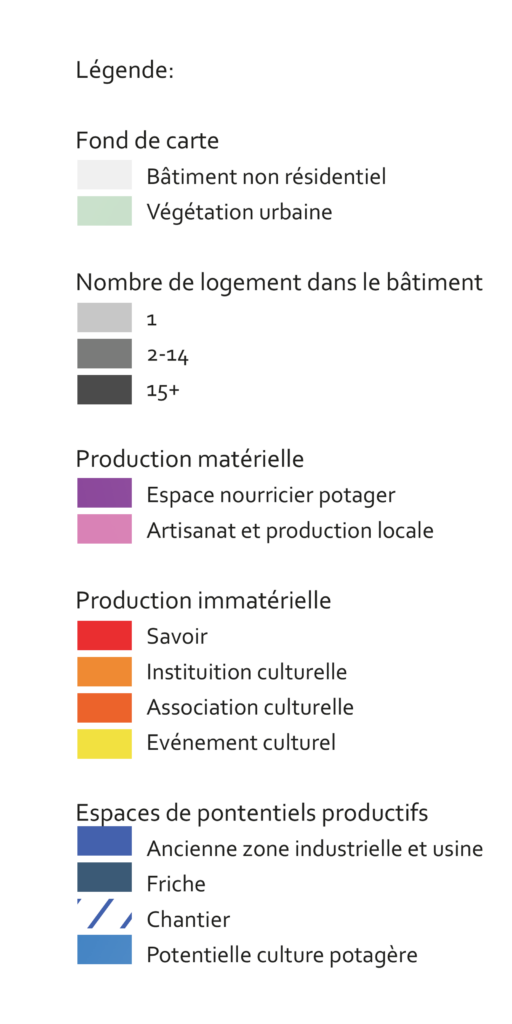 Cette carte vise à mettre en avant les inégalités quant à l’accès et la répartition des espaces productifs de quelque nature qu’ils soient. La mise en parallèle du nombre d’habitant.es de chaque secteur et des espaces productifs montre un décalage entre les secteurs où il serait le plus nécessaire de ramener la production en ville et les espaces disponibles. .