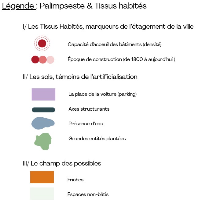 La carte interroge la ville comme un palimpseste, façonnée par des couches successives liées à l’évolution des modes d’habiter. À travers les tissus habités, on montre comment les formes urbaines et les époques de construction révèlent les transformations de la ville. Les différentes textures de sols, axes routiers, parkings, espaces verts et friches apparaissent comme des témoins de l’artificialisation progressive. Les friches et espaces non bâtis deviennent alors des lieux de transition, ouvrant des perspectives de reconquête, notamment végétale, pour la ville de demain.